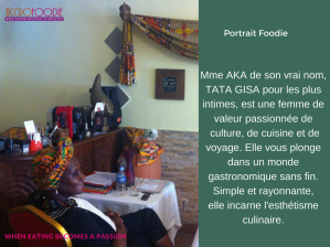 La gérante Mme AKA ou #TataGisa pour les intimes est une femme de valeur, passionnée de culture, de cuisine et de voyage. Avec elle, je vous assure, on embarque toujours pour une destination inconnue, tellement elle vous fait voyager à travers les mets qu’elle confectionne.