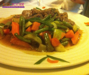 de viande de bœuf découpée en cubes et baignant sur son coussin de légumes. Bon! Pour rester professionnelle et pour bien vous relater les faits, il a fallu que j’y goûte. Agréable dégustation car, le gingembre et le soja mélangés aux autres épices avaient un goût de paradis: les légumes légers, appétissants, cuits comme il le faut et la viande exquise, un vrai régal ! Prix du plat, hmmm…