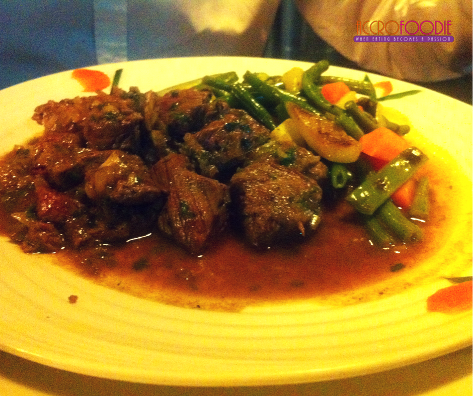 de viande de bœuf découpée en cubes et baignant sur son coussin de légumes. Bon! Pour rester professionnelle et pour bien vous relater les faits, il a fallu que j’y goûte. Agréable dégustation car, le gingembre et le soja mélangés aux autres épices avaient un goût de paradis: les légumes légers, appétissants, cuits comme il le faut et la viande exquise, un vrai régal ! Prix du plat, hmmm…