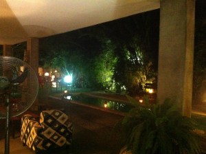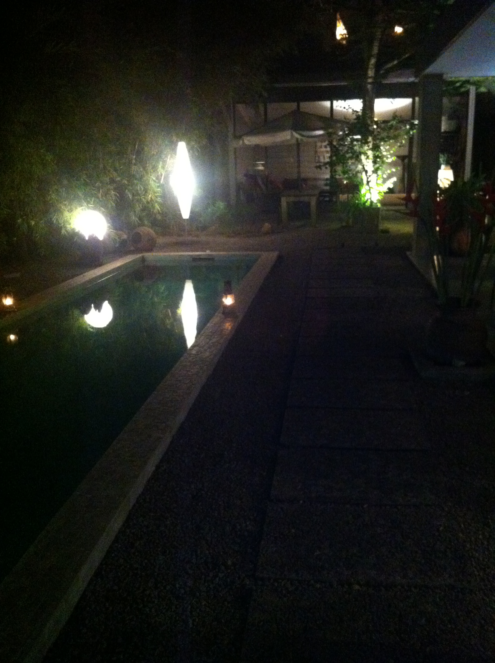 Wooow, l’entrée ornée de part et d’autre par des bambous, le beau petit et sympathique jardin, la mini-piscine avec ces lumières et la belle terrasse à ma gauche pour prendre vos apéros. Goshh tout ça me laisse sans voix.
