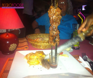 Mon foodiefriend* me rejoint et sans plus attendre, nous passons notre commande. Il me recommande le Chuurasco servit à l’épée accompagné de pomme sarladaises« ; qui selon lui est le best ; pour lui ce sera Purée de pommes de terre aux saucisses de foie.