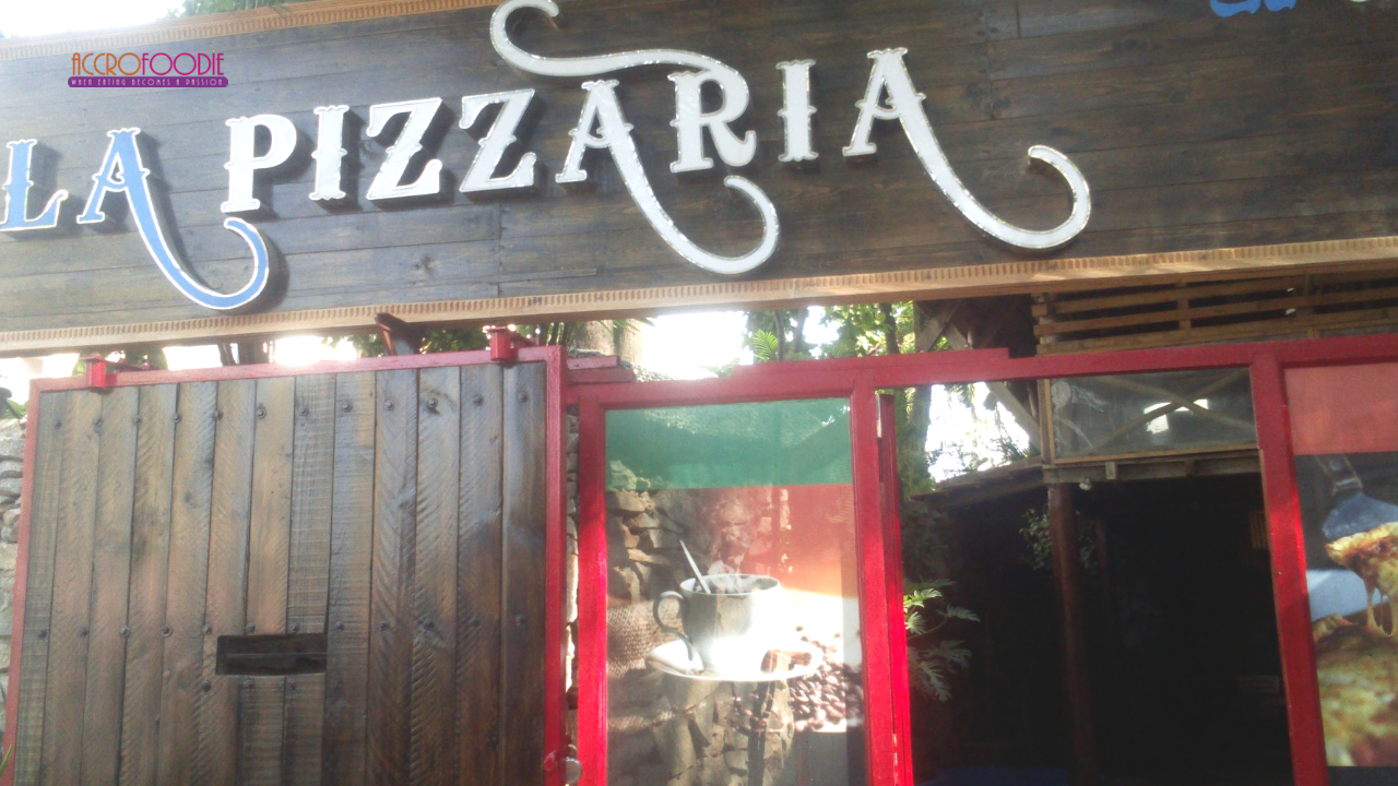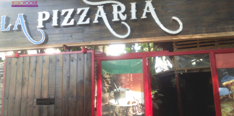 Après la mi-journée, je décide de faire un tour en ville avec un ami gourmand. Etant à moto, nous sommes passés devant un endroit avec une enseigne bien visible où était marqué en grand format « LA PIZZARIA »; le genre de chose que tu ne peux pas manquer. Nous avons fait demi-tour et nous nous sommes garé.