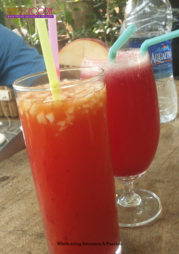 La serveuse nous apporte la carte de menu. Il faisait très chaud (je vous épargne les détails) et pour nous rafraîchir, nous avons pris des cocktails de jus de fruit. Le premier de couleur rouge, c’est le bird of paradise : des fraises plus de l’ananas, du jus d’orange et une fiole de sprite. Le second de couleur orangée, c’est le fruit fantasy : un mélange de plusieurs jus de fruits qui avait un goût d’agrumes, delicieux!. Bon comme vous l’aurez remarqué sur la photo, il fallait que je teste les deux 🙂 ils étaient très rafraîchissants.